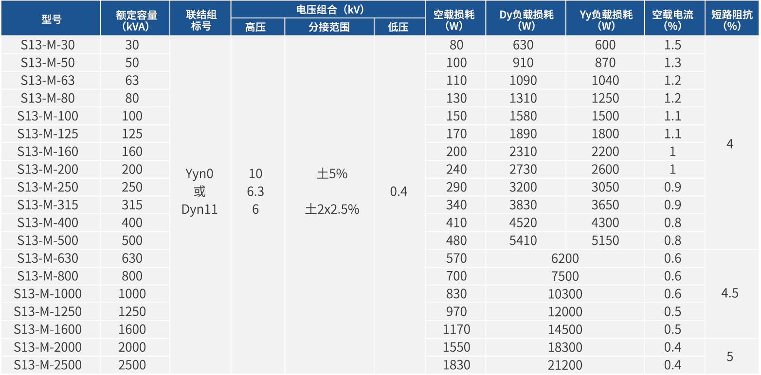 S13型是我公司通过新材料、新工艺的研究运用及自主创新与技术引进结合的方式,通过对铁心及线圈结构的优化创新设计,达到降低空载损耗及噪音的目的,自主开发的产品。噪声水平与现行国标JB/T10088-2016比较平均下降20%,产品性能水平达到国内先进水平。
